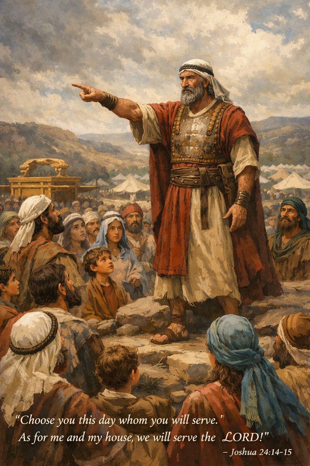 As the years of conquest had passed, the population that could not remember the end of the wanderings, the falling of the manna, the pillar of cloud, the last call by Moses, the fall of Jericho, and the sun standing still was quickly growing. Joshua felt the call of God to, as Moses had done before, present before Israel the choice they would face both individually and corporately as he would soon be laid to rest.
